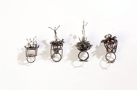 Cally recently graduated from the University of Derby completeing a BA (Hons) Craft, specialising in Metalwork and Jewellery. Her main choice of materials is recycled metal wires and objects as well as pre-fab components such as Nails, Washers, Tacs and Woodstaples. She uses these materials to create dramatic, theatrical and exaggerated versions of jewellery forms. Her work is inspired by fairytales and tall stories, inparticular the sinister elements within these tales, she does this by adding materials to her work such as Porcelain and Enamel to create a contrast in Colour and Texture to emphasize Light and Shade, representing Good and Evil. As well as imagery, Cally also looks at the text of the stories, using a line or a chapter title as an idea for a piece.