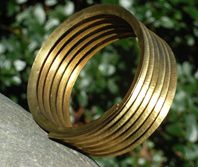 Back in the workshop after a break of five years spent bringing up two little boys my work continues to develop. I enjoy pushing the metals to the limits. Materials include brass, copper, white metal (unhallmarked silver) and gold leaf. The forms are based on spirals and curves. Each piece is individually hammered.