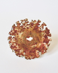 Emerging from an ongoing investigation into material and process, Imogen creates painterly and densely detailed surfaces by using traditional craft skills in unconventional ways. Developed in tandem with a series of drawings and monoprints, this body of work is rooted firmly in the present, while also referencing craft heritage. Milliners’ straw braiding techniques are applied to silver and copper wire, emulating the hand-drawn line. Elements from various enamelling methods such as cloisonné, champlevé and basse-taille are mixed and matched, to create a depth of colour reminiscent of translucent layered inks.