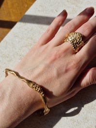 Always finding inspiration in unexpected places, Jade’s latest collection in silver, bronze and recycled gold lets us explore the intricate and sculptural cases of the caddis fly, found living in the bottom of our ponds and streams and combines them with our lust for ancient buried treasure. Jade researched for this collection at London’s Natural History Museum’s, diving into a rich archive of real specimens so she could see them first hand, making drawings and models.