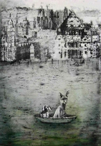 In this exhibition, the dogs adrift on the River Thames recall for me my migrating ancestors and my own journey back across the ocean to make a new home in England. This led me to imagine other journeys, such as Darwin’s voyages which led him to the Theory of Evolution as depicted in my “Darwin’s Creatures” series. Other etchings depict the search for the sublime, in nature, in dance, in love.