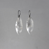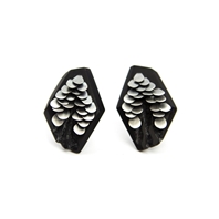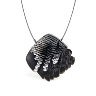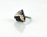 Emmeline combines unexpected and contrasting materials in her Bristol studio. Using her signature techniques of hand carving acrylic and embedding it with metallic elements she creates striking, beautiful and contemporary wearable sculpture. Her pieces are light and wearable with mysterious patterns of gold and silver seemingly organic to the form.