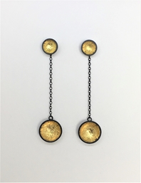 Oxidised white metal, black enamelled concave domed discs with 24ct gold foil fused onto the enamel.