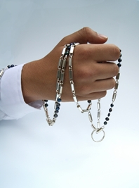 Justine Richards first collection promotes the notion of luxury, but juxtaposes it with the idea that ‘behind every great fortune there is a crime’. These crimes are insinuated throughout the collection through the codes of written texts, evocative and symbolic engravings, textures on designs hinting at the grip of a gun and weight alluding to the idea of a weapon. All of these elements lead the wearer to be intrigued by the hidden undertones and elements of danger.