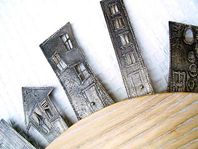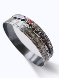 Her jewellery is made by photetching her drawings onto silver which she then assembles, oxidises and adds touches of colour with transfers. She has recently started working in mixed media incorporating this with her silver photoetched components.