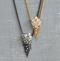 Each piece is created from accumulations of tiny precious and semi-precious beads, meticulously wired by hand onto fine chains with handmade silver and gold pins. Simple shapes take their cue from natural forms: branching vines and clusters of berries and barnacles. Varying sizes of stones and pearls are used cleverly to create subtle organic textures.