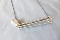 Over the years she has been influenced and inspired by architecture, grids, scientific symbols and currently mathematics. Her work has a minimal aesthetic utilising repeated forms and her love of soldering can be seen in the collections. She works with traditional jewellery making techniques and a few years ago started to use scoring which is a silversmithinmg technique mostly used for traditional box making.